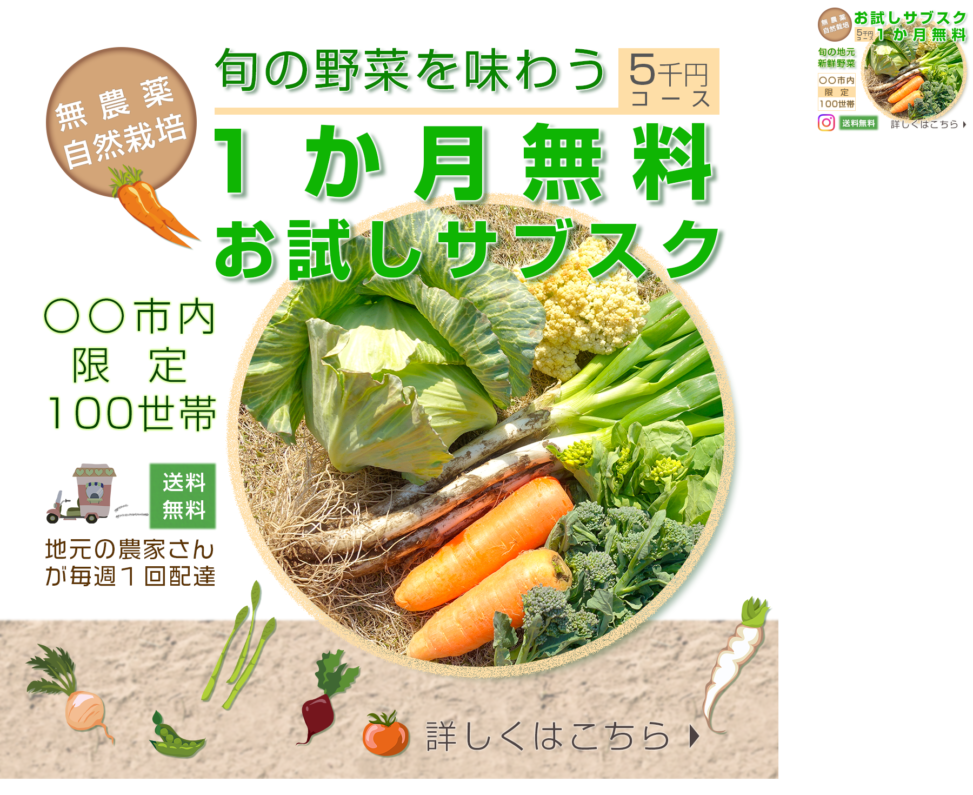 新鮮で無農薬な地元の自然栽培の野菜が毎週届くサービスのお試しができる。